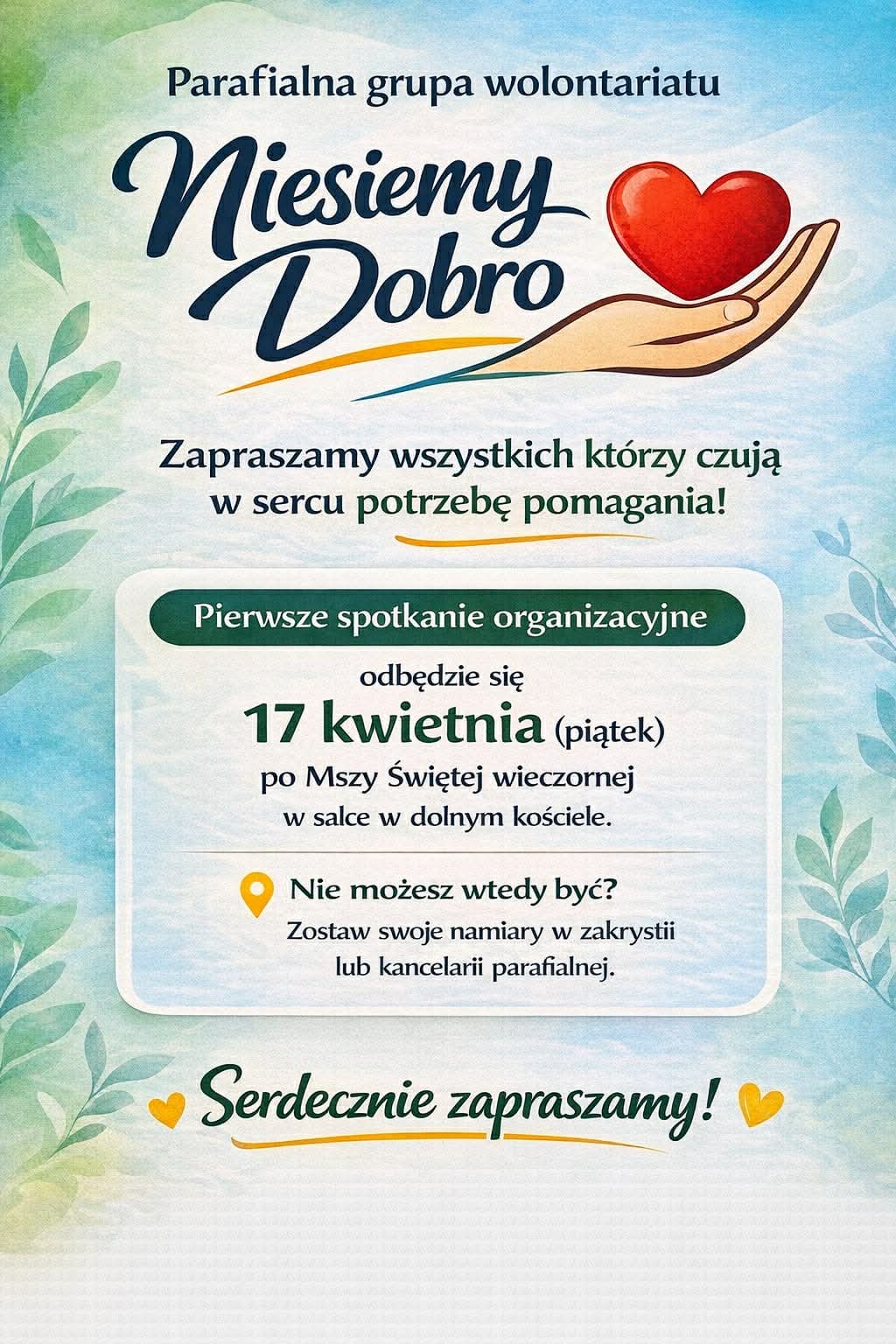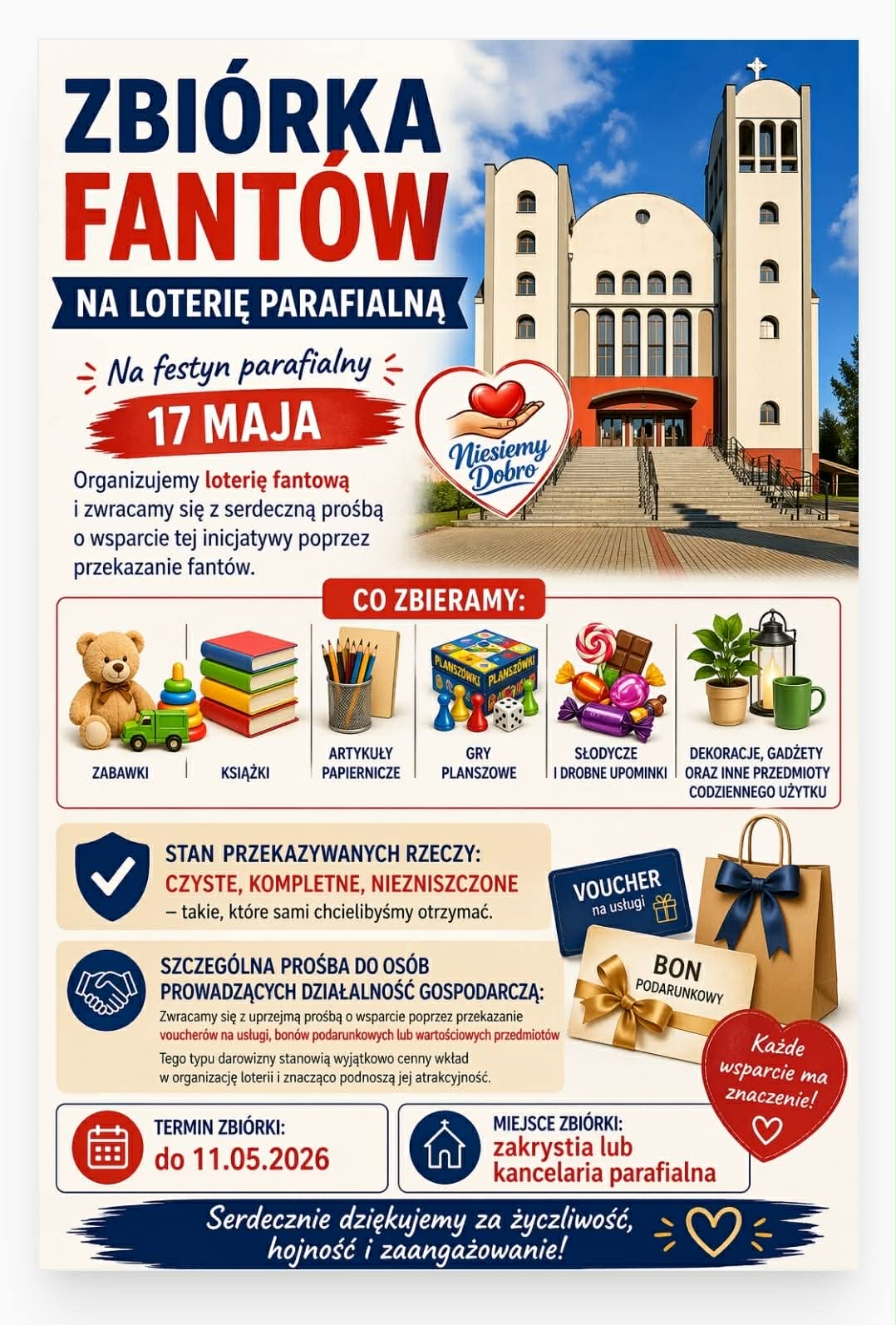 Drodzy Parafianie, 17 maja będziemy przeżywać w naszej parafii uroczystość odpustową. To szczególny dzień dla naszej wspólnoty, który pragniemy uczcić także poprzez radosne spotkanie podczas festynu parafialnego. Jednym z jego elementów będzie loteria fantowa, dlatego zwracamy się z serdeczną, ale i bardzo konkretną prośbą o wsparcie tej inicjatywy poprzez przekazanie fantów. Zbieramy m.in.: * … [Czytaj dalej..]